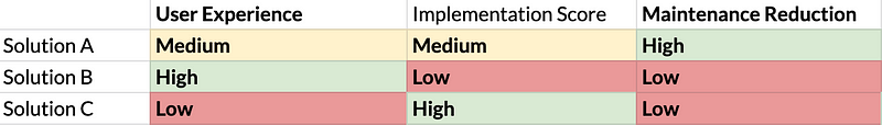 By having alignment on what the most ideal solution would look like, it will make it easier to navigate through possible alternatives and highlight the trade-offs between solutions for non-technical peers. If the importance of a particular criteria would change, it will be straightforward to re-assess the alternatives.