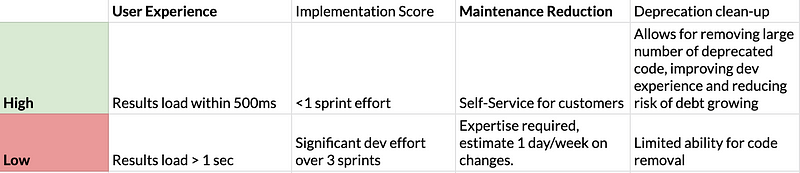 Capture what’s most important, and highlight the top criteria in bold. Describe how a High, Medium or Low scoring solution would look like. You can discuss these trade-off evaluations with various stakeholders beforehand so that everyone is on the same page and knows what we’ll end up comparing solutions against.