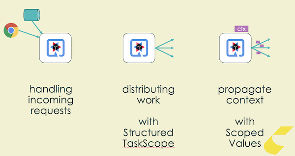In our application we set context specific to the request via @RequestScoped beans (singletons). However, these new virtual threads are no longer associated with Java ‘Requests’ and RequestScoped context. Fortunately a new mechanism has been introduced in order to assign task-scoped state that will be set for any tasks started in a scope (even if started from one of the virtual threads). This is called Scoped Value.